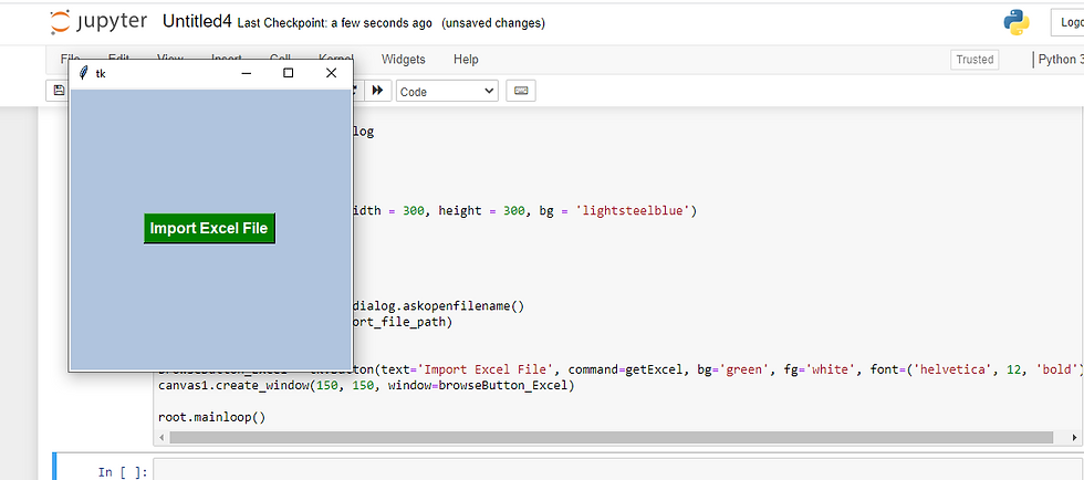import tkinter as tk from tkinter import filedialog import pandas as pd root= tk.Tk() canvas1 = tk.Canvas(root, width = 300, height = 300, bg = 'lightsteelblue') canvas1.pack() def getExcel (): global df import_file_path = filedialog.askopenfilename() df = pd.read_excel (import_file_path) print (df) browseButton_Excel = tk.Button(text='Import Excel File', command=getExcel, bg='green', fg='white', font=('helvetica', 12, 'bold')) canvas1.create_window(150, 150, window=browseButton_Excel) root.mainloop()